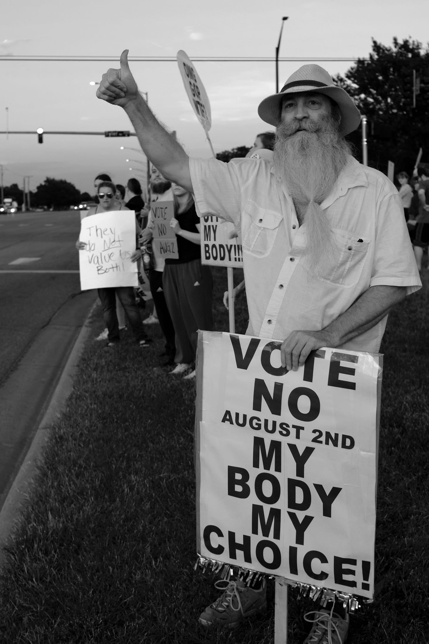 Protestors picket along a roadside in Kansas, urging passers-by to vote against an abortion ban.